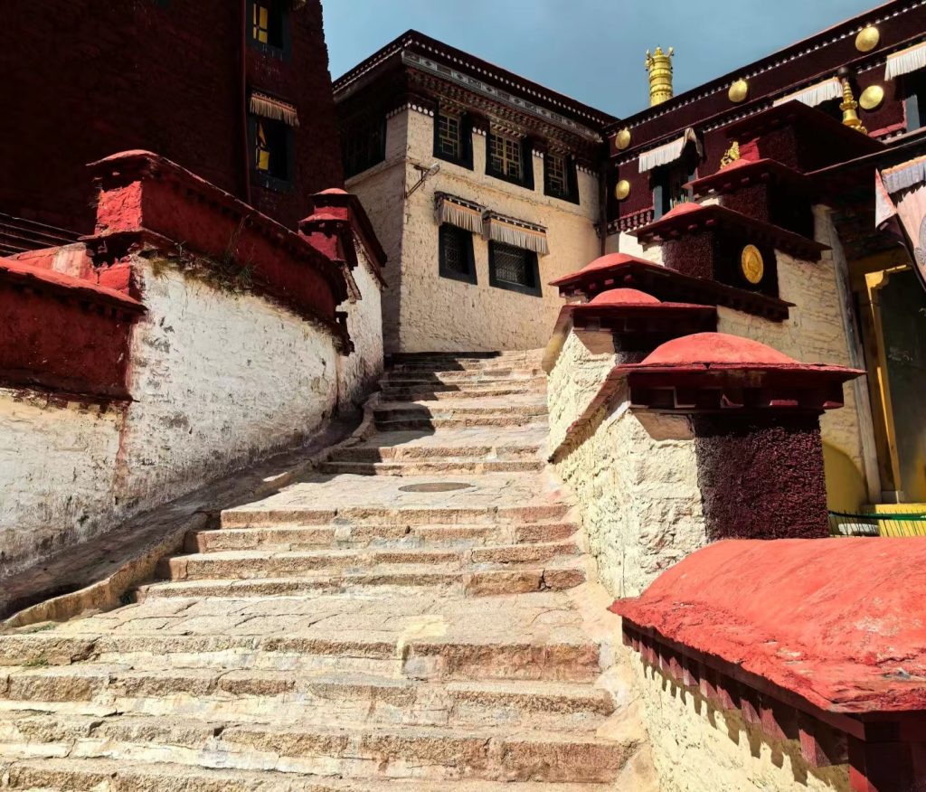 A multi-level sacred structure that includes protector deity halls, meditation rooms, mandala chambers, and stupas (reliquary towers) dedicated to past abbots of the monastery. Its golden roof glows in the sunlight, making it one of the most visually striking buildings in the entire complex.